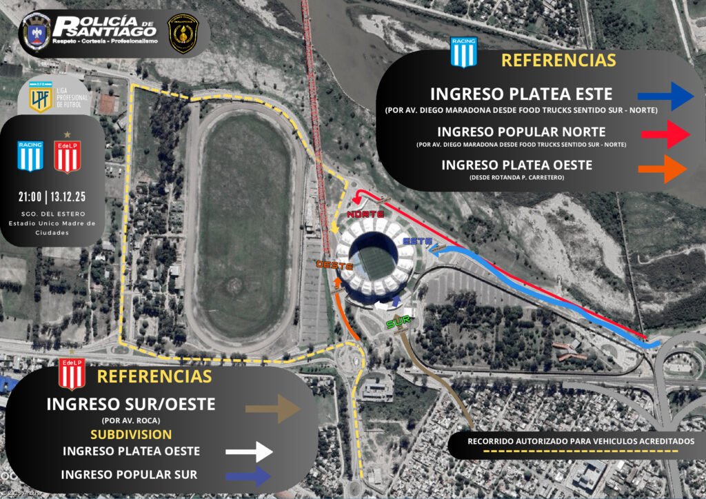 De cara a la gran final entre Racing Club y Estudiantes de La Plata, que se disputará este sábado 13 de diciembre a las 21 horas en el Estadio Único Madre de Ciudades, la Policía de la Provincia presentó el mapa oficial de accesos y circulación previsto para el operativo de seguridad.