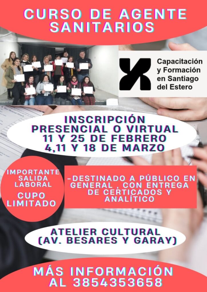 El Atelier Cultural de La Banda anunció la apertura de inscripciones para un nuevo curso destinado a Agentes Sanitarios, una iniciativa que busca brindar herramientas teóricas y prácticas a quienes deseen desempeñarse en la promoción de la salud y la prevención de enfermedades en el territorio.