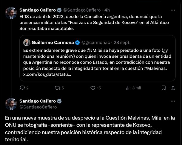 En esta línea también se manifestó el excanciller Santiago Cafiero: «El 18 de abril de 2023, desde la Cancillería argentina, denuncié que la presencia militar de las «Fuerzas de Seguridad de Kosovo» en el Atlántico Sur resultaba inaceptable», explicó.