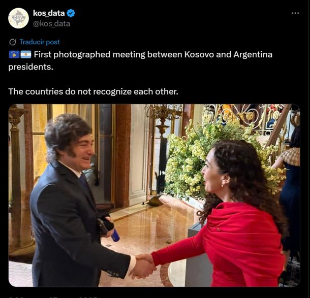 Lo cierto es que la imagen de Javier Milei saludando a la presidenta de Kosovo, Vjosa Osmani, en Nuevo York, durante la Asamblea General de las Naciones Unidas es la primera imagen pública de la historia de un encuentro oficial semejante, lo que despertó críticas de dirigentes opositores.