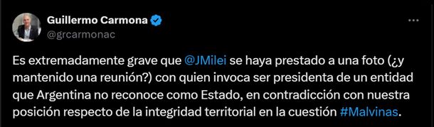 Uno de los que se manifestó en este sentido fue el exsecretario de Malvinas y actual diputado, Guillermo Carmona: «Es extremadamente grave que Javier Milei se haya prestado a una foto (¿y mantenido una reunión?) con quien invoca ser presidenta de una entidad que Argentina no reconoce como Estado, en contradicción con nuestra posición respecto de la integridad territorial en la cuestión #Malvinas», señaló.