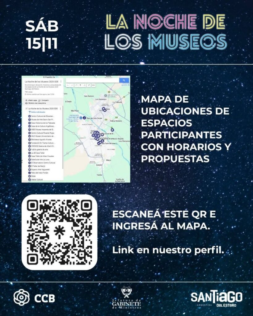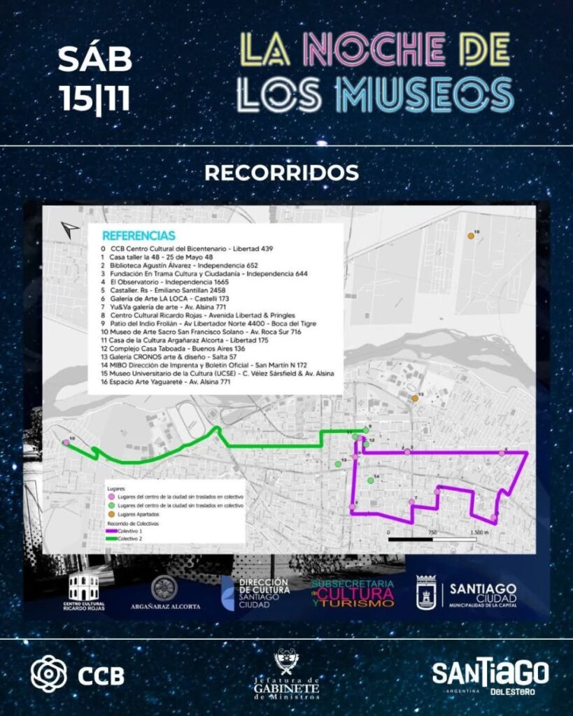 - Recorrido: Los buses recorrerán los diversos espacios culturales y artísticos que forman parte del evento. Entre los puntos de interés se incluyen la Biblioteca Agustín Álvarez, El Observatorio, el Centro Cultural Ricardo Rojas, el Patio del Indio Frolián, la Casa de la Cultura Argañaraz Alcorta, el Complejo Casa Taboada, la Galería CRONOS, y la Dirección de Imprenta y el Boletín Oficial, entre otros.