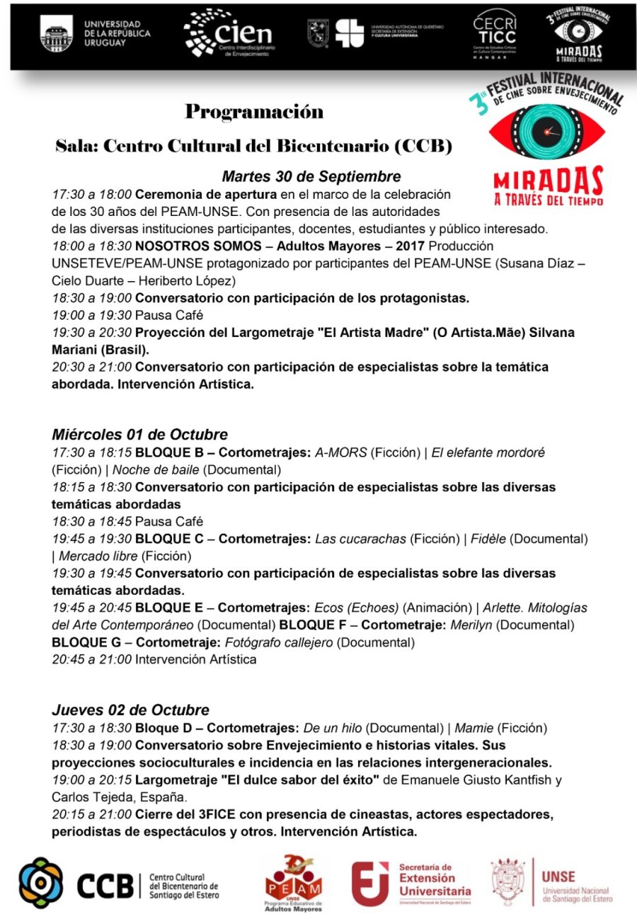 El 3º Festival Internacional de Cine sobre Envejecimiento (3FICE) «Miradas a través del tiempo» se llevará a cabo en el Centro Cultural del Bicentenario de Santiago del Estero (CCB) del 30 de septiembre al 2 de octubre, con acceso libre y gratuito.