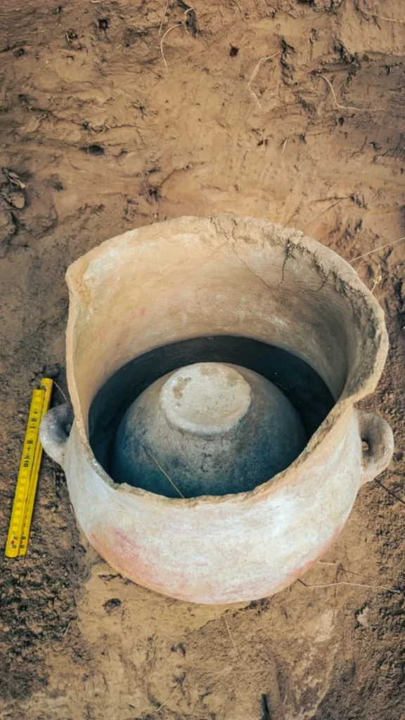 La urna, confeccionada en cerámica, contenía los restos óseos de un recién nacido. El detalle más llamativo fue la presencia de un puco de cerámica colocado boca abajo en su interior, una práctica funeraria que los especialistas interpretan como un símbolo de resguardo y protección espiritual para el infante fallecido.