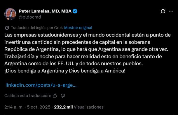 El embajador de Estados Unidos en la Argentina, Peter Lamelas, anunció a través de sus redes sociales que empresas norteamericanas realizarán una «inversión de capital sin precedentes» en el país.