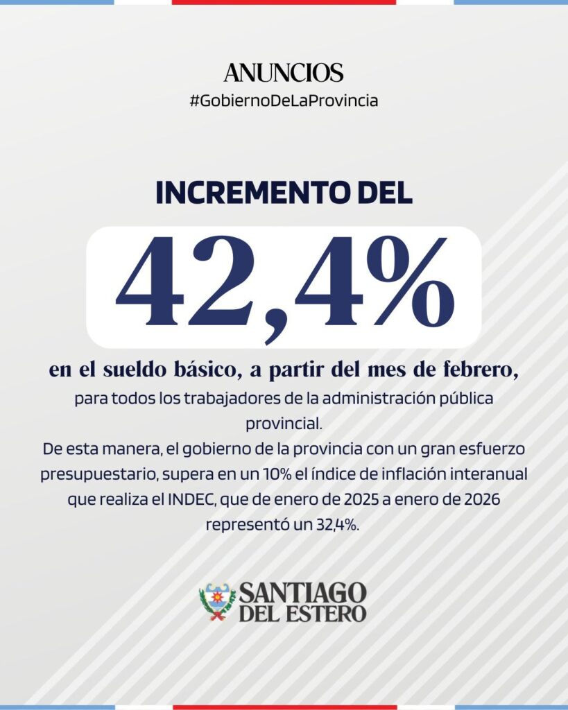 En este sentido, se dispuso un incremento del 42,4% en el sueldo básico, a partir del mes de febrero, para todos los empleados de la administración pública provincial. El aumento supera en un 10% el índice de inflación interanual informado por el INDEC, que entre enero de 2025 y enero de 2026 fue del 32,4%.