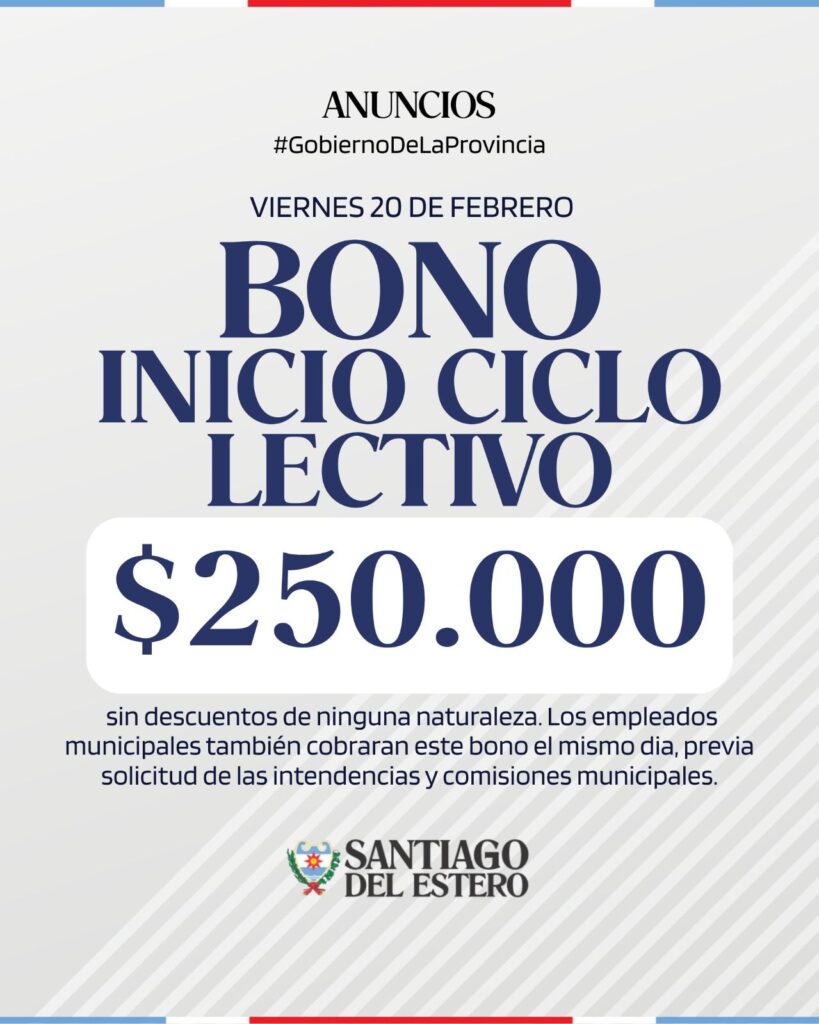 El primer bono, correspondiente al inicio del ciclo lectivo, será abonado el viernes 20 de febrero, por un monto de $250.000 sin descuentos. Asimismo, los empleados municipales también percibirán este beneficio en la misma fecha, previa solicitud de las intendencias y comisiones municipales.