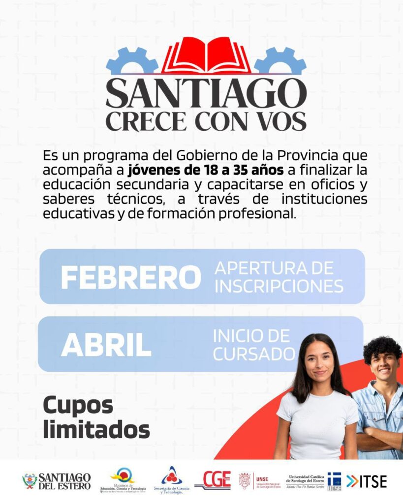 El Gobierno de la Provincia de Santiago del Estero, a través del Ministerio de Educación, Ciencia y Tecnología, impulsa el programa “Santiago Crece con Vos”, una política pública de formación y capacitación laboral orientada a mejorar la empleabilidad y generar oportunidades concretas de desarrollo para jóvenes de toda la provincia. La iniciativa se lleva adelante mediante una amplia oferta de cursos en oficios, servicios y saberes técnicos, con un fuerte anclaje territorial.