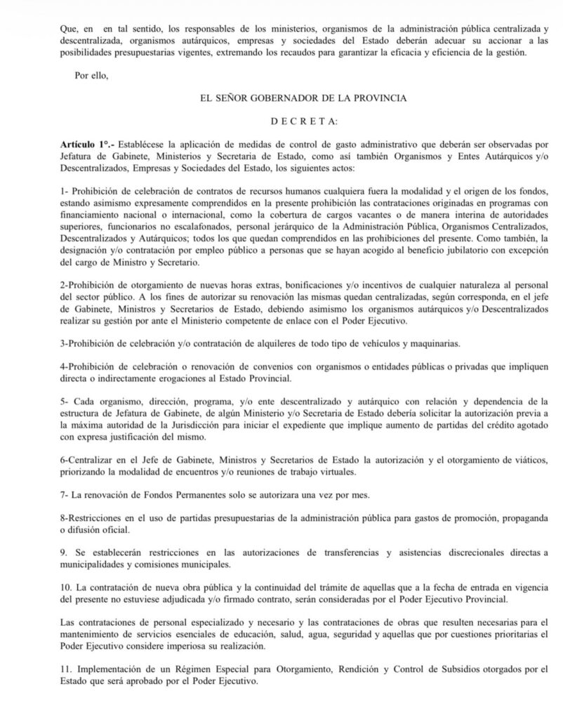 El gobernador de la provincia, Elías Suárez, firmó este martes un decreto mediante el cual se establecen medidas de control, contención y racionalización del gasto administrativo, con el objetivo de preservar el equilibrio fiscal y financiero del Estado provincial, en el actual contexto económico.