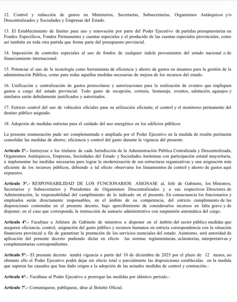El decreto tendrá vigencia a partir del 10 de diciembre de 2025, por un plazo de 12 meses, con posibilidad de ser prorrogado por igual período o dejado sin efecto, total o parcialmente, si se superan las causas que motivaron su implementación. Desde el Gobierno provincial se destacó que estas medidas buscan asegurar una administración responsable de los recursos públicos, priorizando el impacto social y la continuidad de los servicios esenciales para todos los santiagueños.