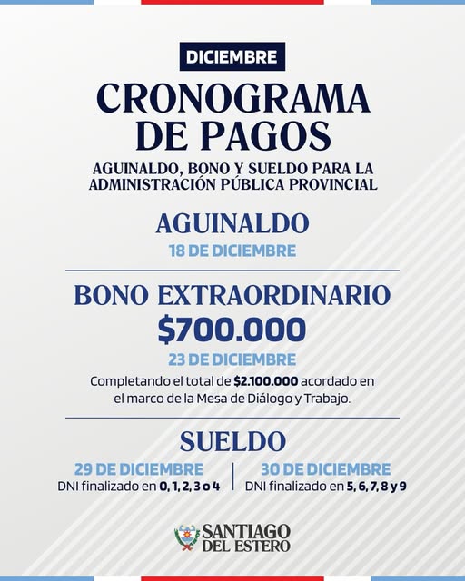 El Ministerio de Economía de la provincia oficializó este viernes el cronograma de pagos correspondiente a fin de año para toda la administración pública, que incluye el aguinaldo, la tercera y última cuota del bono extraordinario y los haberes de diciembre.