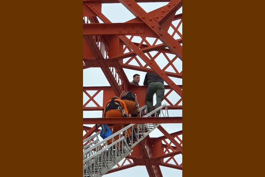 Los especialistas trabajaron de manera conjunta, utilizando elementos para rescate en altura y un colchón inflable para asegurar la integridad física de la persona.