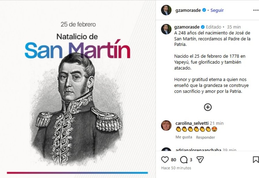 En coincidencia con la fecha patria de este 25 de febrero, el senador nacional Gerardo Zamora utilizó sus canales oficiales para recordar la figura de José de San Martín. Al cumplirse un nuevo aniversario del nacimiento del Libertador en Yapeyú, el legislador santiagueño resaltó la vigencia de los valores que guiaron la gesta sanmartiniana.