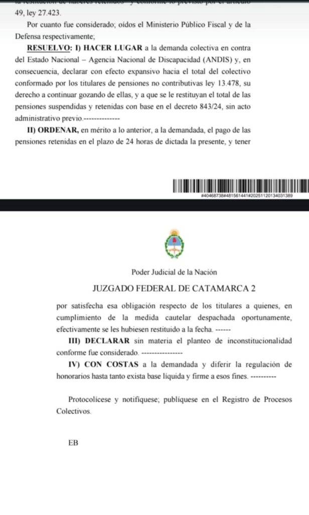El fallo ordena a la Agencia Nacional de Discapacidad (ANDIS) la restitución de todas las 130.000 pensiones no contributivas por discapacidad que fueron suspendidas o retenidas a nivel nacional en base al decreto 843/24.