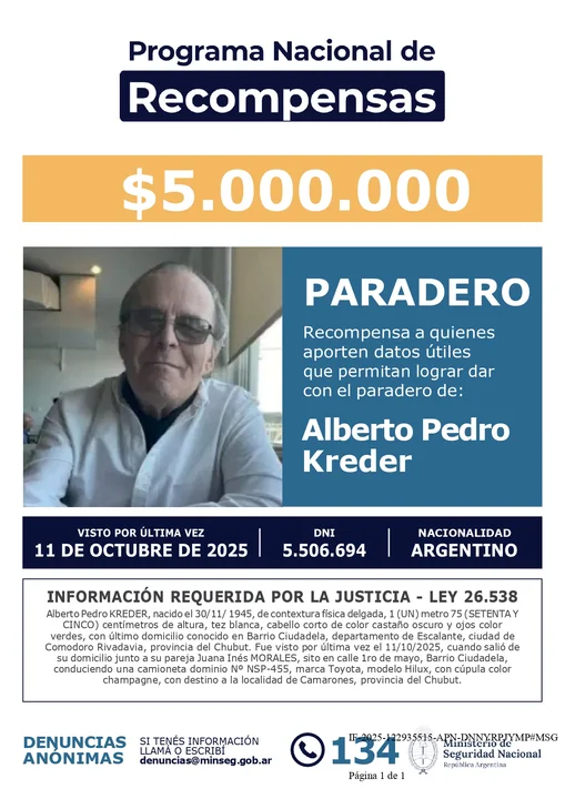 BUENOS AIRES, 10 de diciembre de 2025 – El Ministerio de Seguridad Nacional, a solicitud de la Oficina Fiscal de Comodoro Rivadavia, dispuso el ofrecimiento de una recompensa de $5.000.000 por cada uno para quienes aporten datos útiles que permitan dar con el paradero de Juana Inés Morales y Alberto Pedro Kreder, la pareja de jubilados desaparecida en Chubut.