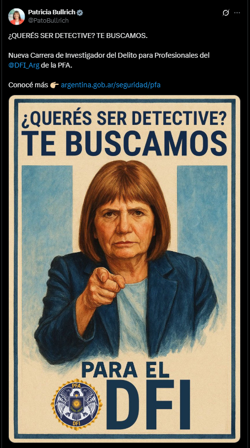 Con estética del Tío Sam, Patricia Bullrich lanzó la carrera de Investigador del Delito en la Policía Federal Argentina (PFA). En las redes compararon la iniciativa de la ministra con División Palermo.